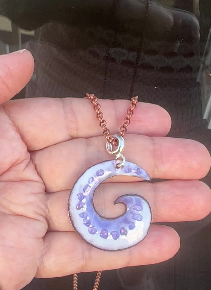 • Artisan Design: Kiln-fired vitreous enamel on a copper base, creating an opalescent white background washed with shimmering purple colors that evoke ocean waves.